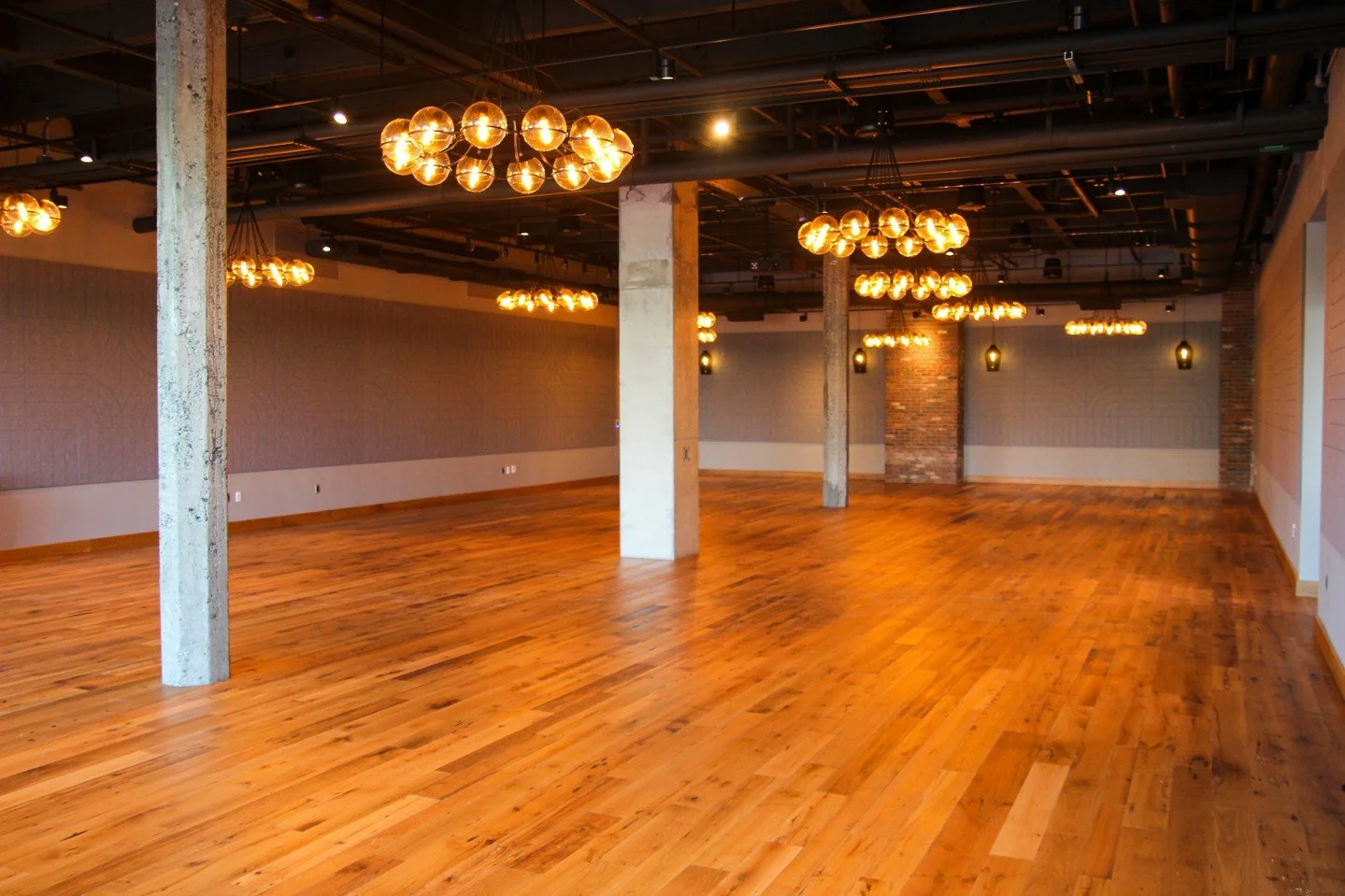 Versatile event space with floor-to-ceiling windows, upscale décor, and sophisticated lighting, seamlessly blending industrial-chic design with a waterfront patio for an elevated experience. -