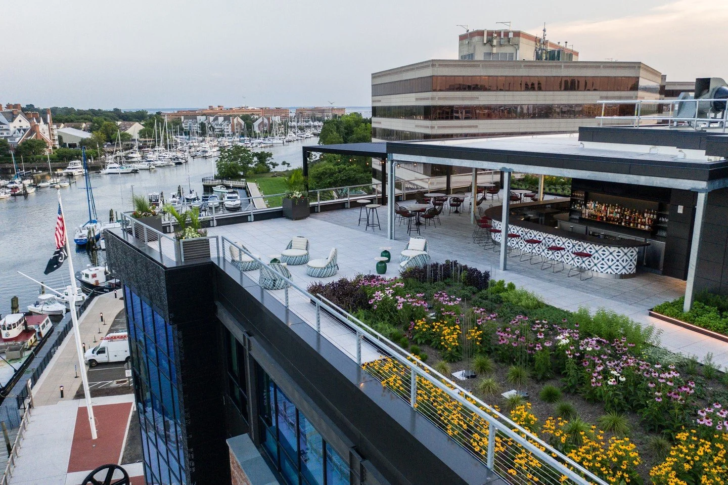 Boasts over 7,500 square feet of stunning rooftop space with water views, lush gardens, a chic bar, lounge seating, pergola and AV capabilities for live music, making it the ultimate venue to impress any guest. -